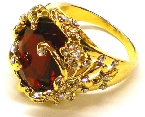 Mooie goudkleurige Sinterklaas ring. In de ring zit in het midden een grote rode steen verwerkt en daaromheen zitten kleine witte steentjes. De ring is verkrijgbaar in verschillende maten.